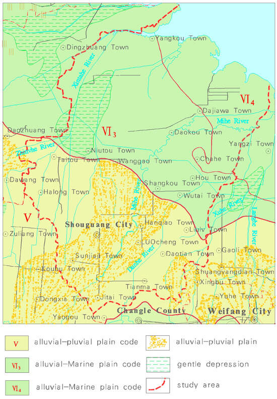 The study area is located in the northwest of Weifang City, Shandong Province. Located to the north of the mountains of central Shandong, it is mainly composed of the Mihe alluvial–pluvial slightly inclined plain and the coastal plain formed by the interaction between sea and land. The geomorphological types transit from the alluvial–pluvial piedmont plain to the alluvial–pluvial piedmont inclined plain and alluvial–marine slightly inclined plain. The terrain is a plain area that descends slowly from south to north. Rivers and surface runoffs flow from southwest to northeast, forming micro-geomorphological differences. The overall topography of the city is divided into three parts and seven micro-geomorphological units (Figure 1).