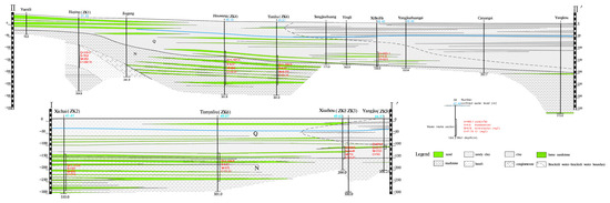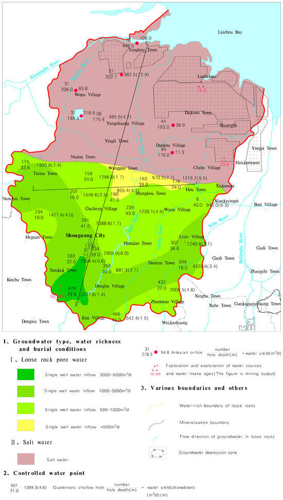 The main type of groundwater in the study area is loose rock pore water. According to the characteristics of the water-bearing medium and lithologic combination and the occurrence conditions of groundwater, the pore water can be divided into shallow pore water and deep pore water. The aquifers of Middle Pleistocene (Q2), late Pleistocene (Q3) and Holocene (Q4) are shallow pore water aquifers. The Piedmont alluvial–alluvial plain area reveals the water-bearing sand layers of the Middle Pleistocene (Q2), late Pleistocene (Q3) and Holocene (Q4). The pore water of the Middle Pleistocene (Q2), late Pleistocene (Q3) and Holocene (Q4) in the northern alluvial–marine plain is salt water, which is not used now, while the pore water of the early Pleistocene (Q1) is fresh water, and the deep fresh water is exploited in this area. The strong phreatic water abundance area is mainly distributed in the Piedmont alluvial fan area south of the Fengcheng-Shouguang urban-Daotian area. The lithology of the aquifer is mainly coarse sand and gravel, and the water yield from a single well is 3000–5000 m3/d. The alluvial fan is in the area of Yuesi Han-Sunjiaji, where the water yield from a single well is greater than 5000 m3/d. From the axis of the alluvial–pluvial fan to both sides, the lithologic particles of the aquifer gradually become finer, and the water abundance gradually weakens. The medium water abundance area is mainly distributed in the vast area to the north of the strong water-rich area. The lithology of the aquifer is medium sand and fine sand deposited in the edge zone of alluvium and floodplain, and the water yield from a single well is 1000–3000 m3/d. The weak water abundance area is only distributed in the local area from Xingyao to Xiazhou. The lithology of the aquifer is mainly fine sand and silty sand deposited by river flooding, and the water yield from a single well is less than 1000 m3 (Figure 2).