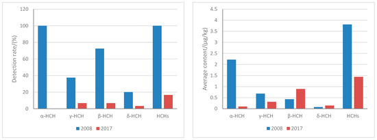 Compared with a survey of OCPs in topsoil in 2008 [40], the residues of HCHs have changed significantly. Generally speaking, both the various isomers of BHC and the overall average content of BHC showed an obvious downward trend. The detection rates of HCHs, α-HCH, β-HCH, γ-HCH and δ-HCH were 100%, 100%, 37.5%, 72.5% and 20%, respectively, in 2008, and decreased to 16.67%, 0%, 6.67%, 6.67% and 3.33% in 2017. At the same time, the average residue of HCHs decreased from 3.81 μg/kg to 1.44 μg/kg, and the average value of HCHs decreased by 62.2% (Figure 4). This was consistent with the fact that the OCPs have been suspended for nearly 30 years. The overall content of BHC also showed a downward trend, but the distribution was different. This was related to local soil features. The soil in the north belongs to sandy loam, with low content of organic matter, low viscosity, and low adsorption to OCPs. The OCPs changed quickly. The clay loam in the south was featured by high viscosity, strong adsorption to pesticides, slow loss of pesticides, and the decreasing rate of BHC content was relatively slow.