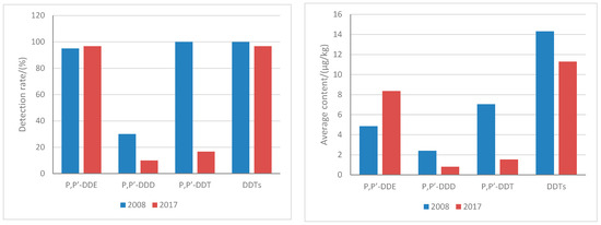 Compared with 2008, the residue and detection of DDTs showed a downward trend, but the downward trend was not obvious. The detection rate of DDTs changed from 100% to 96.67%, and the residue reduced from 14.3 μg/kg to 11.28 μg/kg. This was related to the chemical properties of DDT stability. The p,p′-DDT changed dramatically. The detection rate decreased from 100% to 16.67%, and the residue decreased from 7.04 μg/kg to 1.54 μg/kg. The metabolites were more stable and persistent than their parent compounds (Figure 5).