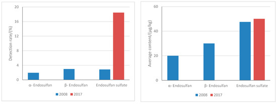 In 2008, the concentration of endosulfan in the samples in the study area reached 7.67 μg/kg, in which the concentration of α-endosulfan was 1.83 μg/kg, and the detection rate was 20%. The concentration of β-endosulfan was 2.98 μg/kg, and the detection rate was 30%. The concentration of endosulfan sulfate was 2.86 μg/kg with a detection rate of 47.5%. In 2017, α-endosulfan and β-endosulfan were not detected. The detection rate of endosulfan sulfate was 50%, and the average content was 18.45 μg/kg (Figure 6). The endosulfan can be degraded into endosulfan sulfate and endosulfan diol. Therefore, the detection rate and content of endosulfan decreased significantly while the average content of endosulfan sulfate increased.