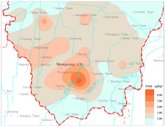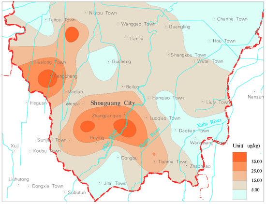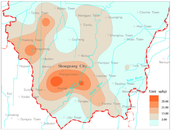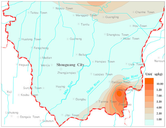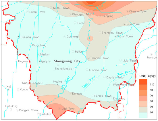 The detection rates of HCHs (the sum of α, β, γ, δ-HCH) were 16.67%. The content range was nd~18.64 μg/kg, with an average of 1.44 μg/kg. The detected area accounted for 23.71% of the study area, which was mainly distributed to the west of Gaojiazhuang-Hanjiazhuang-Xiajiadianzi, and the center was located in the north of Chengnan Village, Shouguang City. The undetected area of HCHs in soil accounted for 76.29% of the study area, which was mainly distributed in the central and eastern part of the study area (Figure 7).