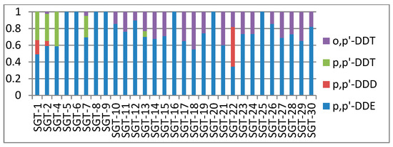 DDT contents were ordered as follows: carrot > balsam pear > pepper > cucumber > cantaloupe > white radish > tomato. The content of carrots was significantly higher than that of other vegetables, which was mainly due to the fact that carrots were beneficial to absorbing OCP residues from soil. The main contents of DDT isomers were p,p′-DDT and p,p′-DDE. Carrots and balsam pear mainly contain p,p′-DDT, which was significantly higher than other kinds of vegetables. Cucumbers, peppers, white radishes and tomatoes mainly contained p,p′-DDE and p,p′-DDD, which showed that the residues were from the original DDT. p,p′-DDE and p,p′-DDD were the original DDT degradation products.