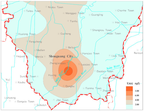 The area of hexachlorobenzene will gradually expand, and the concentration will gradually increase. The pollutants will mainly be distributed in Fengcheng in western Shouguang City and Nanchahe River in the northeast. In 2027, the areas with concentrations exceeding 0.2 ng/L will exceed 200 km2, and the range of concentrations exceeding 0.8 ng/L will exceed 40 km2 (Figure 22).