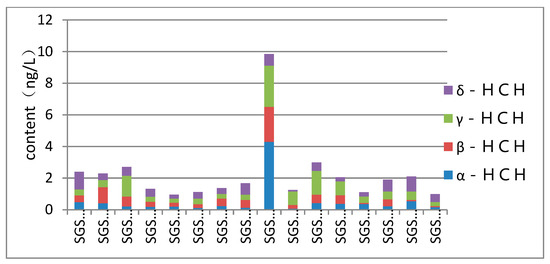 The order of HCHs isomer contents was β-HCH > γ-HCH > δ-HCH > α-HCH. α-HCH was not detected. The content of β-HCH is nd~18.64 ng/g, and the difference between δ and γ-HCH content was not obvious. In the environment, α-HCH and γ-HCH can be converted into β-HCH, resulting in the gradual accumulation of β-HCH and the decrease of α-HCH.