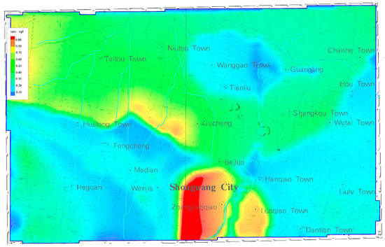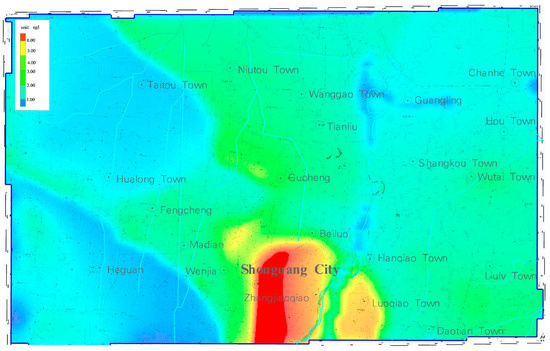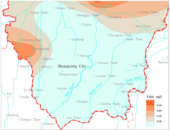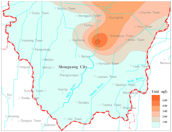Figure 17 shows the distribution of the endosulfan sulfate in shallow groundwater in the study area. It can be seen that the endosulfan sulfate content concentration lower than 0.9 ng/L accounted for 70.92% of the study area, which was mainly distributed in the south of the study area. The concentration within the range of 0.9~5.77 ng/L accounted for 29.08% of the study area, distributed in the northeast of the study area, mainly Shangkou, Guangling and Chakou. The concentrations of endosulfan sulfate in shallow groundwater in these areas were higher than those in other areas.