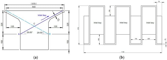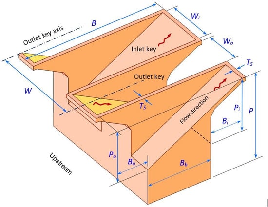 Compared to the labyrinth weir with vertical walls, the PK weir features several more governing parameters. A PK weir is usually divided into four basic types: type A—with both up- and downstream overhangs; type B—with upstream overhang (vertical wall downstream); type C—with downstream overhang (vertical front upstream); and type D—with both up- and downstream vertical walls [11]. For either type, its major feature is that the floors of both inlet and outlet keys are tilted, with vertical sidewalls. With the same notation as defined by Pralong et al. [12] and Pfister and Schleiss [13], the parameter definition for the type A weir is shown in Figure 1.