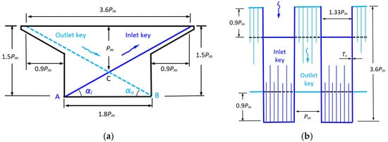 In terms of flow discharge capacity, Lempérière et al. [3] worked out a near-optimal configuration of the conventional PK weir layout, which is used in the present study. With the experimental data obtained at the University of Liege, Erpicum et al. [32] confirmed that the layout proposed by Lempérière et al. [3] is close to the hydraulic optimum. Its longitudinal profile with symmetrical overhangs is shown in Figure 2a, in which Pi = Po = 1.5Pm, B − 2Ts = 3.6Pm, and αi = αo = α = 29.05°. At EDF’s Oule facility, for example, the inlet and outlet key floors are designed with the same angle (α = 29°). The governing size is Pm, i.e., the distance between the crest elevation and the virtual intersection point (C) of the two keys.