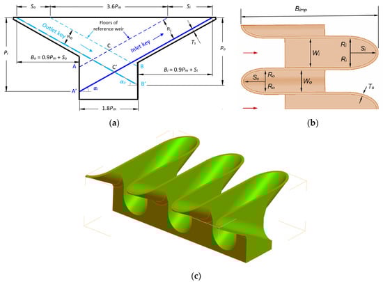 Design of the improved PK weir: (a) longitudinal profile along the inlet key’s center plane; (b) plan view; (c) 3D view, seen from upstream. Arrow indicates the flow direction.