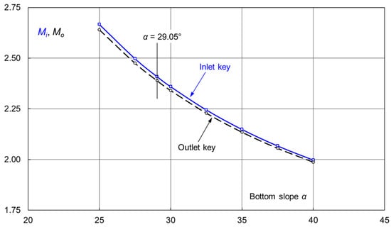 With Ri = 10.00 cm and Ro = 7.50 cm, Figure 5 plots the Mi and Mo variations with α within the 25–40° range. The results allude to the strong dependence on the floor sloping angle. However, for any given α value, the discrepancy between Mi and Mo is negligible, with a relative difference below 1.0%. At α = 29.05° and Ts = 1.50 cm, Mi ≈ Mo ≈ 2.40, implying that, for either key, the elliptical crest is 2.4 times as long as the linear apex of the reference weir.