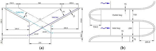 The improved PK weir and governing dimensions of: (a) along inlet key center plane; (b) plan view. Arrow indicates the flow direction.
