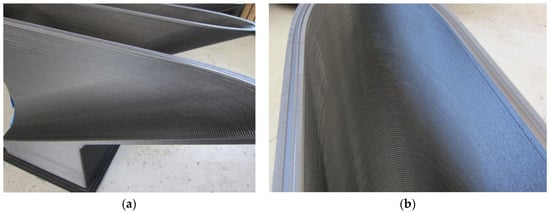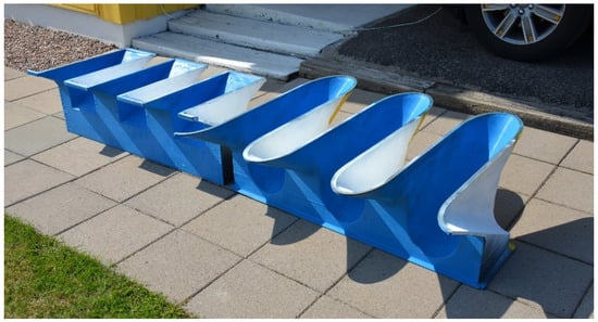The printing polymer is a recycled ABS plastic, black in color. To attain a relatively smooth model finishing, a 6 mm nozzle is used. The key floors are characterized by a relatively small inclination (α = 29.05) and hang over quite a distance in both directions, especially in the improved weir, which limits the choice of layer height. A small layer height, 1 mm, is thus used, also leading to an affordable manufacture price. The cost, including material and printing time, amounts to roughly 3000 EUR per model. The completed model is laser-scanned for quality control, showing that the manufacture inaccuracy is below ±(1–1.5) mm. The reference and improved models, each P = 37.50 cm high and 3W = 114.00 cm wide, weigh 30.8 and 24.8 kg, respectively. This means that, despite its larger length in the flow direction, the latter weighs 19.5% less than the former. Figure 7 shows the surface finishing of the improved model.
