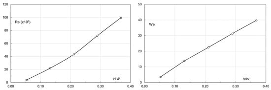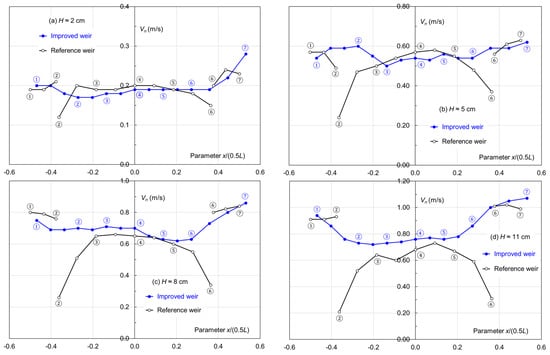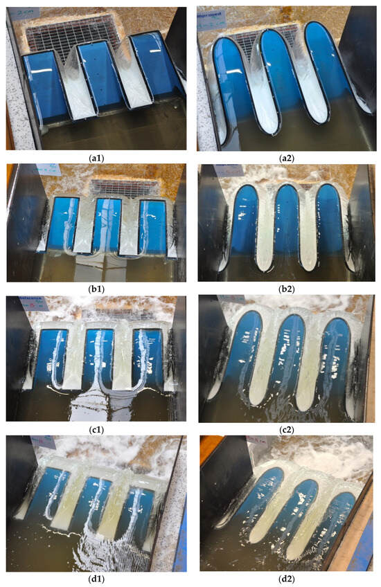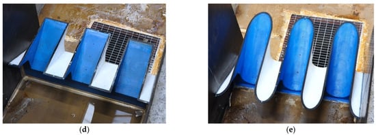 Water stages in the channel are monitored, with both point gauges and floats, all calibrated, at three stations, 2.0 m (M2), 3.0 m (M3), and 4.0 m (M4) from the weirs’ upstream (vertical) front. The water depth over the weir crest is measured directly. A hand-held propeller-type velocimeter is used for velocity measurement. Each flow case is usually repeated three times. The weir crest is 91 cm above the laboratory floor at the impact location. As known, an air cavity might form behind a free-falling jet over such a weir and tends to become enclosed at high flow rates. If so, the sub-atmospheric cavity pressure would result in jet oscillations (instability), which in turn affects the hydraulic performance [36,37,38,39]. To avoid this in the tests, the downstream (vertical) face of either weir is mounted flush with the flume’s lower edge (shown in Figure 9a). In this way, the downstream overhangs are beyond the flume and the falling jets do not enclose the space behind, thus giving rise to the atmospheric pressure acting on both jet sides.
