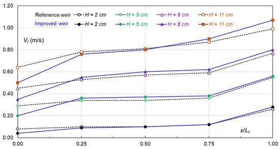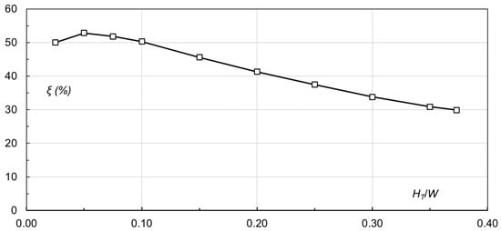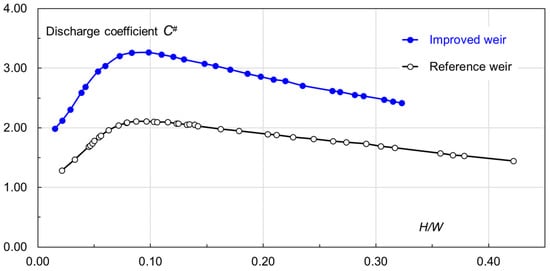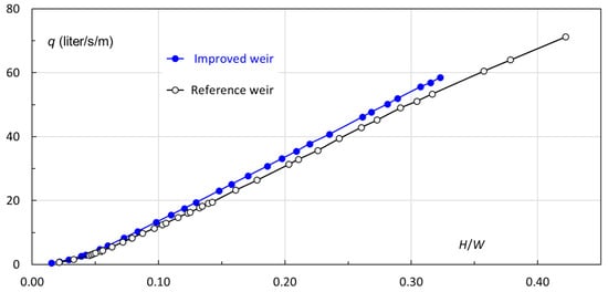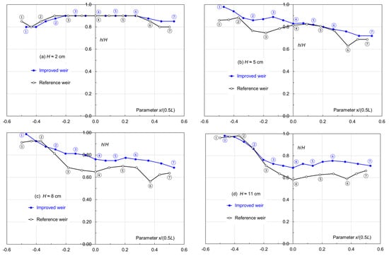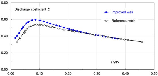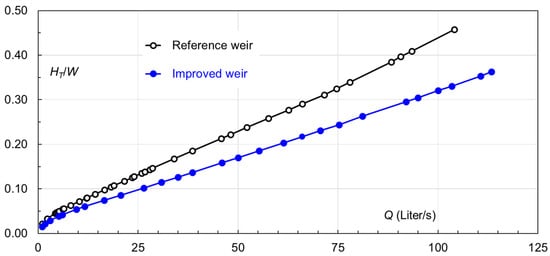 For the reference weir, Qref ≈ 105 L/s at maximum with H ≈ 16.0 cm; for the improved one, Qimp ≈ 117 L/s at maximum with H ≈ 12.3 cm. As a function of HT/W, Figure 10, Figure 11 and Figure 12 present the comparisons between Qimp and Qref, the ξ change, and the differences between Cimp and Cref.