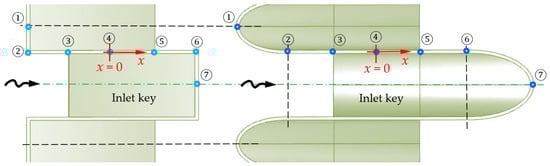 The sloping floors of both inlet and outlet keys of the reference weir are parallelly lowered and replaced with a semi-circle in the cross-section, with their radiuses denoted as Ri and Ro, respectively. Their widths are thus equal to the diameters, Wi = 2Ri and Wo = 2Ro. Figure 4 presents the design concept of the improved PK weir. The reference weir’s basic dimensions are maintained. The unit width (W) is the same; only the overhang apexes are modified with floor adaptations.