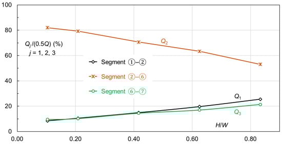 | Qj (j = 1, 2, 3) | Flow rate over crest sections ①–②, ②–⑥ and ⑥–⑦ of reference weir, ∑Qj = 0.5Q |