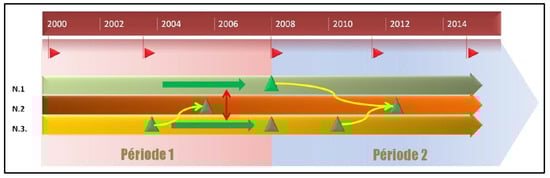 Diagram of the main characteristics of a chrono-systemic timeline (red triangles: key dates; N.x: ingredients or sub-systems; green triangles: milestones; arrows: connections and relationships). (Source: []).