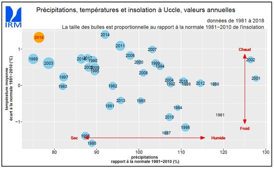- Institut Royal Météorologique. Bilan Climatologique Annuel, 2018; Institut Royal Météorologique: Uccle, Belgium, 2019; p. 6. [Google Scholar]