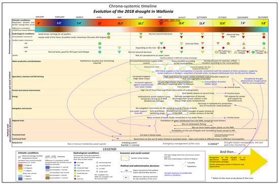 Therefore, this study was carried out in order, on the one hand, to better decipher the overall process of drought kinetics in a context where this event can be considered as emerging—which can reasonably be said in the case of Belgium—and, on the other hand, to better understand the holistic and interdisciplinary nature of this climatic phenomenon. The study was conducted as part of a wider project on the management of hydrological climate extremes in Belgium, the main research question of which is aimed at improving stakeholder anticipation and crisis management of such events. These objectives were achieved through the use of an original and innovative tool, the chrono-systemic timeline, which offers a wide range of analytical inputs. The approach used to tackle this issue and build the timeline is feedback analysis—a concept that can be defined as the learning engine of the risk management cycle with the aim of improving a system’s resilience [,]. In this case, the feedback used as a basis for the descriptive analysis is the experience of an institutional structure present at the heart of a recent water deficit event. The scope of the study was chosen to be regional—in this case Wallonia (the southern part of Belgium)—rather than national, because of the many disparities between the north and south of the country in terms of meteorology, natural resources, and regional planning, as well as the regionalization of many of the political powers affected by a drought crisis. The experience thus gathered was then transcribed into the chrono-systemic timeline, so as to obtain a globalized and multi-sectoral visualization of the crisis.