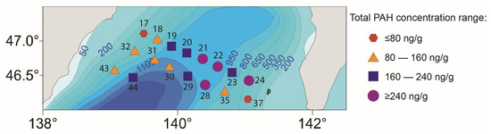 The results of the spatial PAH distribution revealed a heterogeneous pattern. In general, the smallest PAH concentrations were found to be closer to the continental and Sakhalin Island shelves, while most of the highest concentrations were observed at the bottom of the deep-water sites of the Tatar Trough (Figure 2). Even a positive moderate correlation between the total PAH concentration and the sampling depth was observed (p = 0.02, n = 17). This pattern differs from the typical circum-continental PAH distribution when the maximum concentration is usually found closer to the coastline where industrial and human activities are located or near the estuaries of polluted rivers, while toward the open deep sea, the PAH content decreases [48,49,50]. However, the PAH concentration in the Yellow Sea sediment similarly increased with an increasing distance from the coastline toward the open sea, which is explained by the specific hydrologic dynamics and sediment mode [51]. Previously, it was established in the Tatar Trough that sediment accumulation occurs not on the shelf slope but mostly lower [52]. Accordingly, the high PAH concentration in the deep sites can be attributed to sediment deposition mode in the study area.