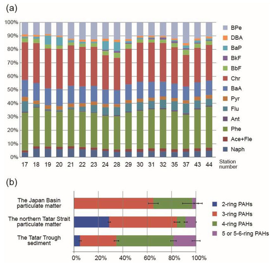 (a) Percent contribution of individual PAHs (Ace and Fle were quantified as a sum) in surface sediment of Tatar Trough. (b) Comparison of relative contribution of 2-, 3-ring PAHs, 4-ring PAHs, and 5- and 6-ring PAHs (mean ± SD) in particulate matter in the water column of the Japan Basin (based on data from [66]), particulate matter in surface water of northern Tatar Strait (based on data from [67]), and sediment of Tatar Trough.