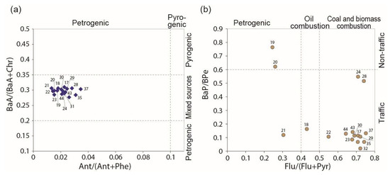 Figure 6 shows the results obtained for the following ratios: Ant/(Ant + Phe); BaA/(BaA + Chr); Flu/(Flu + Pyr); and BaP/BPe. The first two ratios revealed a stable narrow range of values for all stations (Figure 6a). It should be noted that some research has found that for sediment samples, the Ant/(Ant + Phe) better identifies petrogenic PAH sources, while the BaA/(BaA + Chr) is a good indicator of pyrolytic pollution emission sources [72]. The Ant/(Ant + Phe) values ranged from 0.2 to 0.3, indicating petrogenic PAH. BaA/(BaA + Chr) was in the range of 0.28–0.31, which means a mixture of petrogenic and pyrogenic sources of PAHs.