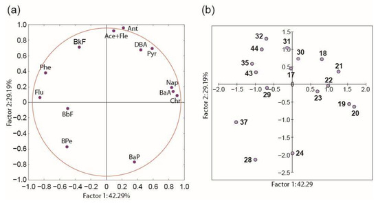 The first factor corresponded to 42% of the total variance and was determined by the largest positive values of loadings of Chr, Nap, and BaA and negative values of Flu and Phe (Figure 7a). It is difficult to attribute the grouping of compounds to whether these PAHs are of pyrogenic or petrogenic origin here since both of the PAH groups similarly include both three- and four-ring PAHs. However, if we take into account that the Flu/(Flu + Pyr) ratio showed the petrogenic origin of the PAHs in the samples of Sts. 19–21 (Figure 6b), where the highest factor loadings of Nap, Chr, and BaA were detected (Figure 7a,b) and where these PAHs were parts of various types of coal [75,76], it can be assumed that this group of PAHs, on the positive side of the axis, is associated with petrogenic sources. As for PAHs loading the negative axis, Phe was found to be the largest PAH released from coal combustion in power plants and boilers ([77] and references therein). Moreover, the boilers use forest biomass and bituminous coal as fuel and release BbF, Phe, DBA, and Flu in the largest quantities. As can be seen, all these PAHs, except DBA, contribute to the negative loading of Factor 1 (Figure 7a). Since the combined use of coal and wood biomass is often used for heating in households in this region of Russia, it can be assumed that this group of PAHs is of pyrogenic origin.