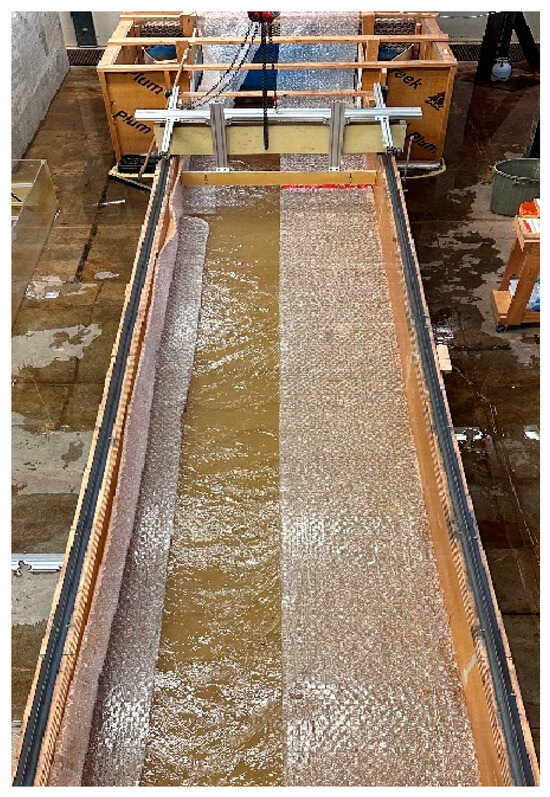 A 14-m-long, 1.2-m-wide flume was constructed using high-density overlay (HDO) plywood with a bed slope of 0.26% for the experiments (Figure 1). The simulated ice cover was made of flexible plastic bubble wrap. To achieve the desired ice coverage ratio (the ratio of the top width covered by ice to the total top width) and prevent lateral movement of the simulated ice during each partially ice-covered test, the bubble wrap was nailed to the flume wall at the appropriate elevation (Figure 2). A layer of uniform silica sand, 70 mm thick, with a median diameter (d50) of 1.3 mm, was evenly distributed along the entire flume length to simulate a sand bed. At the downstream end of the flume, a fixed step with dimensions of 1.2 m in width, 0.6 m in length, and a height equal to the sand height was installed. The purpose of this step was to create a separation between the movable sand and the sediment trap, which was positioned downstream of the step. The sediment trap was partitioned into a few separate bins oriented in the streamwise direction. This division of the sediment trap allowed for precise measurements of the bedload transport rate in both ice-covered and open sections of the channel. All experiments were carried out at room temperature, while actual border ice formation in the field occurs at temperatures near zero. The current research did not explore the impact of varying water temperatures. Further details of the experimental setup and procedure can be found in Rouzegar and Clark [27,29].