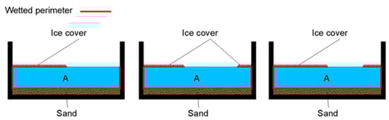 For each test, dimensionless flow strength () and cross-section averaged dimensionless bedload transport rate (ϕ = ) were calculated (to calculate ϕavg, the total mass of dry sand within the entire sediment trap was taken into account.), where τb = average bed shear stress, τ = cross-sectional average shear stress (τ = γS), = the hydraulic radius, S = water surface slope, g = gravitational acceleration, D = particle diameter, and Δ = s − 1 (s = specific gravity of sediment). The calculation of the shear stress at the channel bed (τb) involved multiplying the cross-sectional average shear stress (τ) by 1.2, as suggested by Peters [35]. Peters utilized a log-law fitting procedure for comparable hydraulic conditions within the same experimental setup. Rouzegar and Clark [27] further investigated the impact of ice cover on the flow dynamics, measuring the velocity profiles for each coverage ratio using a Nortek Vectrino II profiling acoustic Doppler velocimeter (ADV), and calculated the bed shear stress distribution by fitting the log-law to each velocity profile. Since the results obtained from Rouzegar and Clark’s [27] analysis closely matched those reported by Peters et al. [1], the consistency and reliability of the findings confirm the results used in this study. The wetted perimeter and area for different conditions of asymmetric border ice are shown in Figure 3.