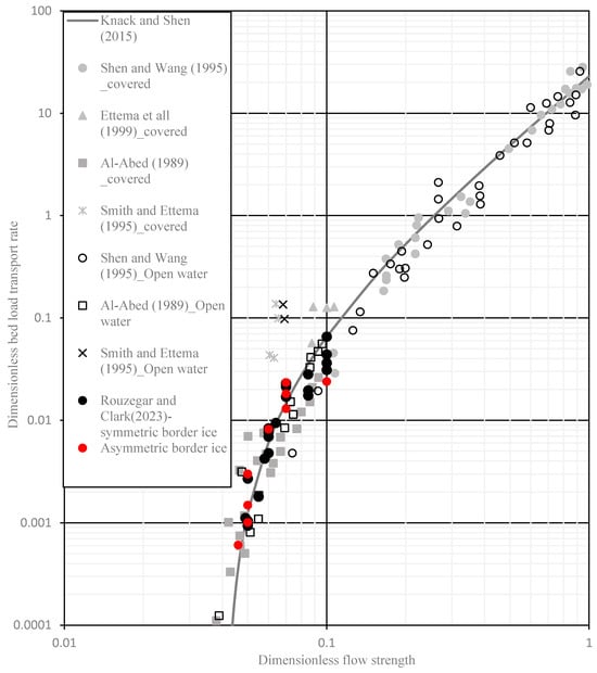 Figure 4 compares the cross-section-averaged dimensionless bedload transport rate derived from the current set of experiments involving asymmetric border ice with data from previous studies that examined symmetric partially ice-covered, fully ice-covered, and open channel flow conditions. The figure also includes the empirical equation proposed by Knack and Shen [36] (Equation (2)). Remarkably, this empirical equation aligns fairly well with the data from the current experiments, implying that it has the capability to predict the cross-section-averaged dimensionless bedload transport rate in asymmetric partially ice-covered rivers, similar to Rouzegar and Clark’s [27] findings for symmetric border ice conditions.