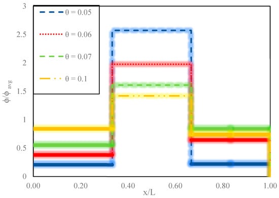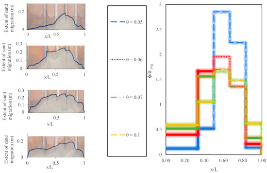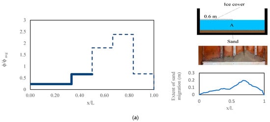 Rouzegar and Clark [27] demonstrated that in rivers characterized by symmetric border ice for a constant coverage ratio and high dimensionless flow strength, the difference of bedload transport rate in the middle section and the side sections wasn’t significant. However, at low dimensionless flow strengths, the relative bedload transport rates at the sides were significantly lower than those in the middle. This is presented in Figure 8, where the high flow strength experiment has open water and ice-covered value of ϕ/ϕavg of 1.41 and 0.84, respectively; while the lowest flow strength experiment covers a much greater range of ϕ/ϕavg from 2.57 to 0.2. Careful inspection of all the experiments will reveal that the flow wasn’t perfectly symmetric, despite controlling the experimental conditions as carefully as possible.
