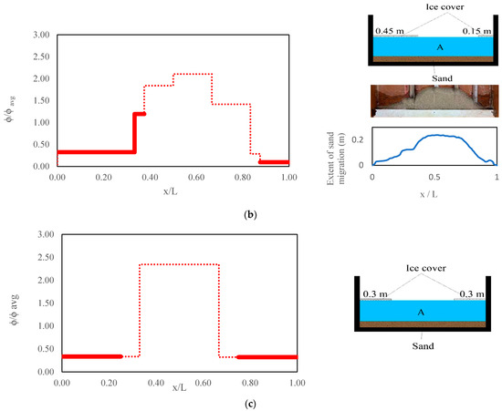 Figure 5 illustrates the bedload transport rate distribution in the aforementioned experiments. In this figure, x represents the distance from the flume wall, and L denotes the flume width. Also, thick lines correspond to the covered sections, while the dotted line indicates the open sections. Figure 5c illustrates the bed load transport distribution across the channel width in the presence of symmetric border ice, with the peak value located at the center of the channel and the minimum value observed in the corners. The presence of symmetric border ice causes lower relative bedload transport close to the banks and greater relative bedload transport in the middle section [27]. Asymmetric border ice can cause even more redistribution in the bedload transport rate, leading to a non-uniform distribution of bedload transport across the channel width. That is, the peak values of bedload transport tend to be concentrated in the center of the open flow section rather than the center of the channel in symmetric border ice flow conditions (Figure 5a,b). The greater the level of border ice asymmetry, the more asymmetry in bedload transport rate distribution was observed. Also, the difference of ϕ/ϕavg in the open section and the covered section is more significant when the level of asymmetry increases.