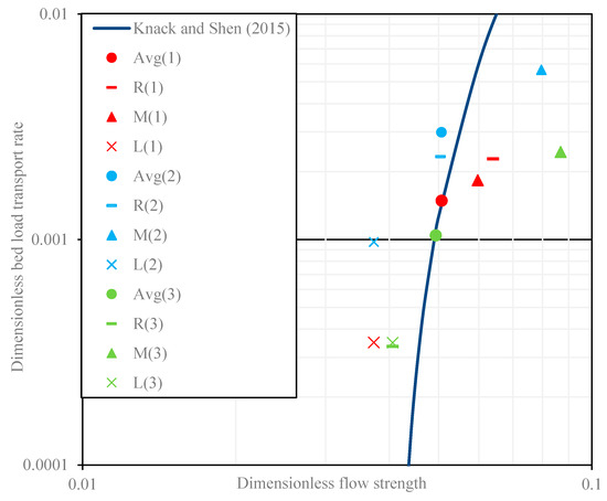 Comparison of dimensionless bedload transport rate in the left, middle, and right sections of the channel [36].