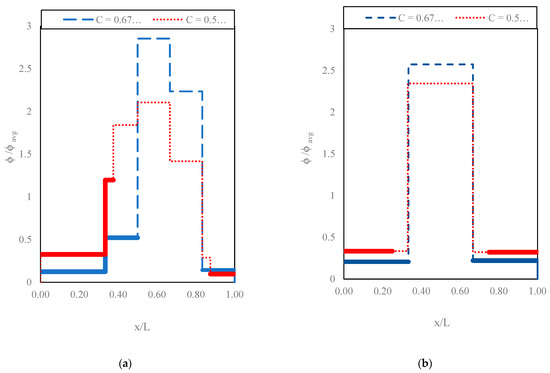 The effect of the coverage ratio was investigated by comparing two groups of tests under symmetric [27] and asymmetric conditions (Figure 7). In each group of the test, flow strength was kept constant while varying the coverage ratio. The results showed that increasing the coverage ratio caused an increase in ϕ/ϕavg in the central section, while it caused a decrease in ϕ/ϕavg in the side sections for both symmetric and asymmetric conditions. These findings confirm that ice coverage contributes to a relative reduction in bedload transport rate in the covered sections and a relative increase in bedload transport rate in the open flow section. Also, as the coverage ratio increased, there was a greater redistribution in bedload transport, resulting in a less uniform f distribution along the cross-section.