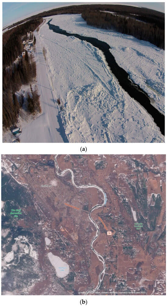 Asymmetric partially ice cover in meandering river: (a) Dauphin River, Manitoba, Canada, Dec 2014 (freeze-up season) (Images courtesy of S. Clark and A. Wall); (b) Bulkley river, British Columbia, Apr 2023 (beak-up season) (Images courtesy of USGS).