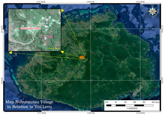 The location of Nubutautau village on the volcanic platform of Viti Levu Island, Fiji.