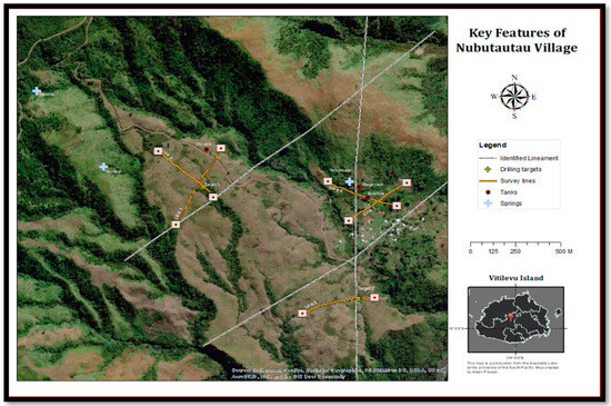 The field site was first assessed through lineament analysis using the Google Earth satellite tool. The analysis was used to view the orientation, topology, and known structural faults. Further, it required connecting points of the abrupt changes through geological features where the same orientations were observed, as shown in Figure 2. Three major lineaments were identified using Google Earth satellite imagery to match similarity in the features. Two of the lineaments were parallel, with an SW–NE trend, and one with an S–N trend, which was directly in line with a perennial spring located south of the village that discharges straight into Sigatoka River [17]. The usage of the lineament analysis was to match the topological and geological features using a desktop-based approach to narrow down the potential zones and kick-start the survey. The second stage of the assessment was based on physical inspection of zones picked by the lineament map, which required moving through the bushes, valleys, and mountains to assess the physical topography. This stage of the inspection was necessary to match the lineament analysis map and inconsistencies with the physical topological features. A better view in terms of the precise details about the topography provides a good analysis of existing features such as the perennial and intermittent creeks, dikes, ground slopes, and the type of soil drainage with soil density [21,22]. The analysis through the inspection of the target areas to work within was followed by the experimental setup, which required the assembly of the instruments with the specified procedure. Instrumentational field work was performed subsequently to check the desktop-based assessment and to verify and confirm a location.