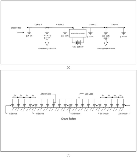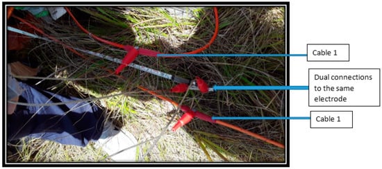 Each survey line had 20 electrodes, which injected current in the ground surface and received it back into the ABEM Terrameter LS2 in the memory storage device. The assembly of each cable with its sub connections to the electrode connections can be seen in Figure 3b. Cables 1 and 2 were on the left side of the ABEM resistivity device, while cables 3 and 4 were on the right. The cable mechanics were examined in two parts: one was in terms of being read by the ABEM Terameter and the other was being read in the field. The two readings were due to the ABEM Terrameter being coded such that it functions in between cables 2 and 3. The consecutive cables on each side were connected through a common electrode, which was jumpered twice with dual subconnections from survey cables (Figure 4) and was classified as an overlapping electrode (Figure 3a) for the continuity of the cable. Each cable catered 20 electrodes for the current to be injected into the ground surface; the 21st electrode functioned as an overlapping electrode on which the overlapping of the two cables from each side was conducted. The double jumping was to ensure the cable binding and free flow to current, countering the impedance found in different sections of the survey points. The cables were moved linearly through the cable mechanics along the path length of the ground until they covered the whole survey profile length; the mechanics required approximately 3–4 new positionings of the Terrameter LS2 device to complete each full profile. The ABEM Terrameter LS2 records the ground resistivity values and converts them to the apparent resistivity, which is later used by the Res2dinv64x software to produce multiple iterations with the least error in the results.