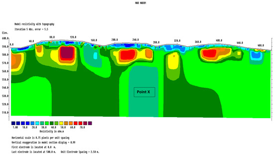 - A high-resistivity layer (>100 Ohm.m) suggesting the presence of unweathered high-resistivity material, such as basaltic material, at the base was observed in survey lines 4 and 5, indicating low to no groundwater potential at depth [17]. The geophysical results displayed are in terms of the ERT along five survey lines, as presented in Figure 5, Figure 6, Figure 7, Figure 8 and Figure 9.