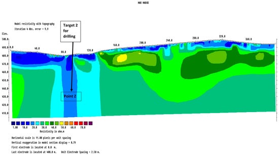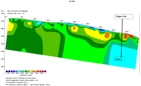 Survey line 2 was laid in the southeast to northwest direction (SE–NW) orthogonal to survey line 1 and intersecting at 285 m (Figure 2). The tomogram showed a possibility of groundwater presence as per the lower resistivity within the range from 320 to 360 m shown in Figure 6 with the resistivity values ranging from 25 to 30 ohm.m. The orthogonal direction was chosen to cross checkpoint X from survey line 1 with the hypothetical approach and assumption that a part of the aquifer was captured but not fully indicated. Alternatively, it was also executed to verify if there was any other occurrence of groundwater in a region of lower resistivity adjacent to survey line 1. Substantial groundwater accumulation with promising drilling potential was interpreted at 240–360 m along the profile within the deeper half of the section to about 37.5–65 m bgl, as shown in the same figure. The resistivity range indicates gravels saturated with fresh water and weathered basalt, with freshwater present at the point. This revealed some interesting features with resistivity variation in the suitable range for groundwater development, labeled as point Y. The lower resistivity represented by point Y is connected to point X of the first survey line, demonstrating a conceptualized groundwater-bearing containment unit in a volumetric 3D existence of the aquifer through the very low resistivity value of about 15–30 ohm.m, revealing a water-bearing unit with sharp boundary features. It is certain that if drilling is performed at any point within the range of 320–360 m, a water table would be reached upon the drill rig reaching an average depth of 60–65 m bgl. All the other regions within the survey line revealed a high resistivity of 45–55 ohm.m and low-conductivity geological elements like basaltic materials [27]. Inferences about the water presence as detected and revealed by survey line 2 showed a water-bearing zone that has a possibility of higher porosity, storativity, and permeability within the confined aquifer, which may have a higher tendency to hold and retain water in large quantities and volumes [28,29,30,31]. The 340 m point with a range of 320–260 m is suitable for the placement of target 2, due to considerations to avoid destruction to vegetation near the adjacent perennial creek found closer to the endpoint of the survey line. It is possible during the future drilling of the point of interest at 340 m locations that water extraction would be obtained upon the drill rig reaching the minimum depth of approximately 40–60 m bgl.