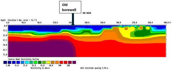 Survey line 4 and survey line 5 were run in the same area and in perpendicular directions to each other. Survey line 4 ran in the east to northwest direction (E–NW) direction, 400 m in total length, and was adjacent to the location where the old borehole was installed. Survey line 4 was indicative of a clay geological presence near the ground or on the surface, as shown by the resistivity value of 5 ohm.m (Figure 8). The thick clay distribution was mainly from the silty loam observed during the old borehole drilling within the depth of about 0–6 m bgl, spreading linearly to a range of about 150 m of the survey line and then decreasing in depth beyond a range of 160 m. The old borehole was drilled at the location of 160 m; the well was poorly inefficient in yielding a good rate of a water leak, before completely drying out. Lithological changes within the depth profile of the borehole have been observed and documented by SPC [17], as shown in Table 1. This hydrogeologically suggests that a small amount of water obtained during drilling existed within a certain range of the sub geological profiles through seepages from the other sources, and this was separated by the impermeable rock layers [41]. Figure 8 reveals different layers, with the lower resistivity values ranging from 20 to 25 ohm.m from the surface to 20 m bgl depth, indicated by the pale blue indicator. This shows an interesting feature of multiple layers with increasing trends of resistivity values lying adjacent to one another being indicative of the possibility of the permeability and non-permeability of existing water movements through different layers. The previous groundwater investigation at the northeastern part of the village showed the underlying rock formation composed of siltstone up to 24 m of the survey range before a weathered and fresh basaltic unit was encountered between 24 and 51 m. The tomography also shows that the thicker layer of higher resistivity, varying 100–200 ohm.m from 30 to 40 m bgl, is interpreted as having almost zero water occurrence. The bottom high resistivity from 40 to 75 m bgl accounts for the heavy basaltic rock with a resistivity of >200 ohm.m, which later channels into the Sigatoka river and forms a thick bed of basaltic pillow lava with interbedded siltstone and sandstone [42]. The groundwater potential along this survey line is not recommended.