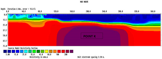 Survey line 5 was run in a similar zone to survey line 4 and in a perpendicular direction intersecting survey line 4 at 180 m (Figure 2). This line was laid in the NE–SW direction and was the shortest profile with a length of 385 m. The orthogonal direction was used to cross-check the possibility of any adjacent aquifer present from which water was moving towards the old borehole. The entire full profile of the survey line showed overlaying layers of thick clays, visible during the entire field survey work. As shown in Figure 9, the resistivity varied 20–25 ohm.m within the length of 0–80 m, detecting the presence of clay, silty sandstone, and surface freshwater in the form of perched features of water seepage. The range length of 80–385 m resistivity varied between 5 and 15 ohm.m; at approximately 50 m on the line was a region represented by rich clay and the presence of brackish water as there existed a small flowing creek and drain structure with little existence of water content. The water existence demonstrated was an indication of the surface water, which is seen as a slight pigmented point at approximately 50 m of the survey line on the resistivity profile. It reveals a thin, shallow, and unconfined groundwater body in existence and is believed to be a localized perched aquifer overlaying low-permeability weathered lava flows. Beyond the depth of 14–75 m bgl of the entire 385 m survey range, the resistivity values increased gradually, indicating the presence of zero water occurrences. The thicker bed of portion located at point “K” ranging between 120 and 280 m at approximately 30 m bgl reveals the presence of very high igneous metamorphic rocks such as those containing basaltic material. This bed of rock continues at the deeper level within the geology of Viti Levu, common to survey line 4, and is seen outcropping in the Sigatoka River [42]. The possibility of any groundwater occurrences on survey line 5 was absent, with zero recommendations for future drilling tasks.