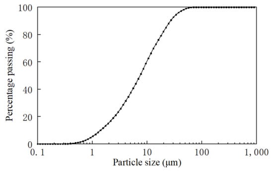 The dredged mud used in the sedimentation tests was extracted during a river dredging project around the Dongting Lake area in Hunan Province, China. According to the Standard for Soil Test Methods [32] (GB/T 50123-2019) the basic properties of the dredged mud are presented in Table 1. The grain size of the mud sample is tested and analyzed using a laser particle size analyzer. The particle size distribution is shown in Figure 1. The soils mostly comprise fine particles, of which 34.33% are clay particles and 65.58% are silt particles. The particle size dimensions D10, D50, and D90 of the mud are 1.557 μm, 8.24 μm, and 29.64 μm, respectively. Given that the slurry at the river and lake dredging site is usually transported using a slurry pump, the original slurry pumped into geotextile tubes is typically diluted to low-concentration slurry with approximately 400% water content. Therefore, the dredged mud is mixed with water and stirred into the slurry with the designed water content of 400% before the settling column tests.