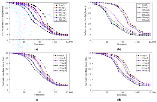 Settlement curves of flocculant-treated slurry under filtration of woven geotextiles: (a) Geotextile 1-NPAM, (b) Geotextile 2-NPAM, (c) Geotextile 1-CPAM, (d) Geotextile 2-CPAM.