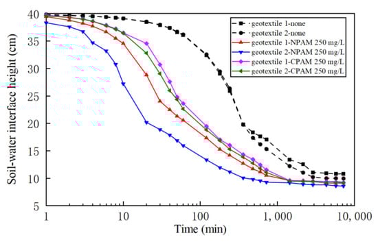 Settlement curves of the slurry added with the optimal concentration of flocculant are shown in Figure 4. Upon adding flocculant at its optimal concentration of 250 mg/L, geotextile 2 outperforms geotextile 1 in promoting the separation of mud and water. Regardless of the geotextile used, NPAM demonstrates a superior efficacy in promoting separation over CPAM. With geotextile 1, the settling ratios (the ratio of the settlement to the initial height) of slurry with 250 mg/L NPAM, 250 mg/L CPAM, and without adding flocculant are 13.6%, 8.8%, and 2.2%, respectively, in 10 min, and the settling ratios are 77.0%, 76.8%, and 73.0% at final states. When using geotextile 2, the settling ratios of slurry with 250 mg/L NPAM, 250 mg/L CPAM, and without flocculant are 32.0%, 8.9%, and 2.2%, respectively, in 10 min, and the final settling ratios reached 78.5%, 77.3%, and 75.1%, respectively.