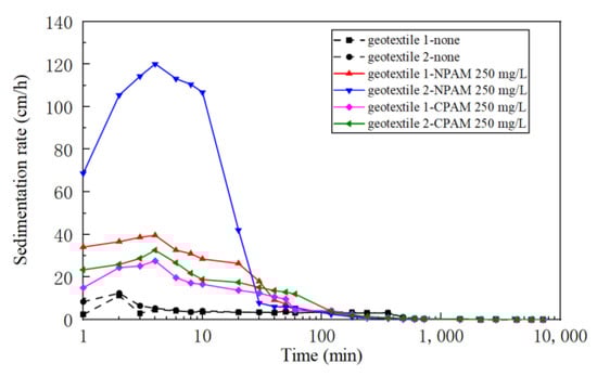Figure 5 shows the comparison between different settling rate curves of slurries when treated with flocculants at their optimal concentration of 250 mg/L. For slurries treated with flocculants, the settling rates are higher compared to those without flocculants, and the trend of settling rate curves remains consistent across all four tested conditions involving flocculant addition. That is, the effect of flocculation on sedimentation is significant in the first 1 h, when the settling rate first increases, then decreases, and remains high; after 1 h, the settling rate rapidly decreases to approximately zero. The order of the peak settling rate is geotextile 2-NPAM, geotextile 1-NPAM, geotextile 2-CPAM, geotextile 1-CPAM, geotextile 2-no flocculant, and geotextile 1-no flocculant. The maximum settling rate peak after flocculant addition is 73.95 cm/h, 8.8 times the peak sedimentation velocity (8.43 cm/h) without flocculants. For the same flocculant, geotextile 2 accelerates slurry sedimentation more effectively than geotextile 1, and the settling rate of slurry after using NPAM is higher than that after using CPAM; that is, the flocculant promotes slurry sedimentation. This effect is more substantial than that with geotextiles. This results from the charge interactions between the flocculants with different ionic and slurry particles. NPAM, being nonionic, does not have charge repulsion issues, allowing for more effective absorption bridging regardless of the slurry’s charge. This results in larger flocs that are more effectively retained by larger apertures (O95). In contrast, the ionic nature of CPAM may lead to charge repulsion with certain soil particles, when the zeta potential of the particle itself exceeds the optimal threshold of destabilization, resulting in less effective flocculation or smaller flocs that do not settle as quickly.