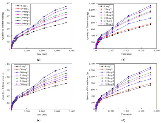 Quantity of Cumulative Filtered Water as a Function of Time: (a) Geotextile 1-NPAM, (b) Geotextile 2-NPAM, (c) Geotextile 1-CPAM, (d) Geotextile 2-CPAM.