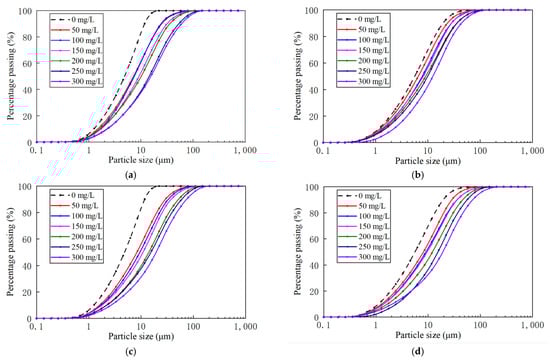 Mud Particle Size Distribution Curve with Different Flocculant Concentrations: (a) Geotextile 1-NPAM, (b) Geotextile 2-NPAM, (c) Geotextile 1-CPAM, (d) Geotextile 2-CPAM.