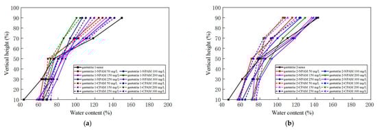 Distribution curve of water content in the vertical direction after settlement: (a) Geotextile 1, (b) Geotextile 2.