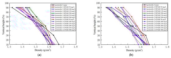 Figure 10 shows the vertical distribution curve of mud dry density when sedimentation is complete. It is indicated that the greater the distance from the bottom geotextile, the lower the dry density of the mud. Analogous to the vertical distribution of the final water content of the mud, the variation in vertical dry density across different sedimentary layers diminishes after flocculant addition.